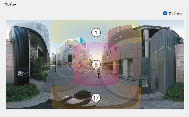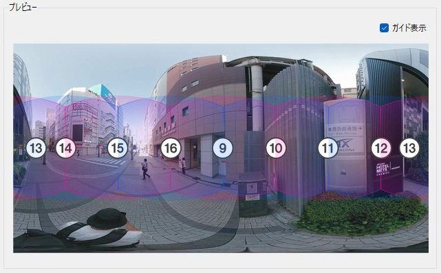 このガイドを使う事で、水平角度を調整したり、360°カメラだとどうしても映り込んでしまう自分のカットを除外して切り出すことが可能になります。