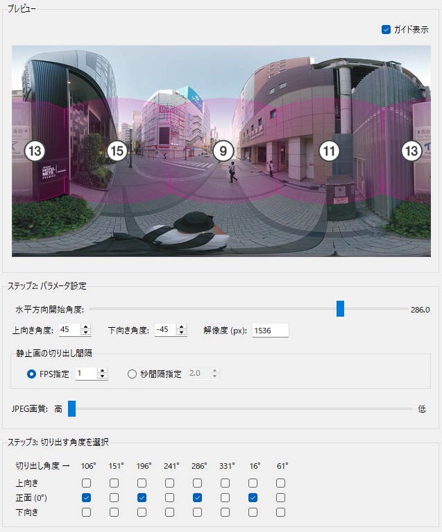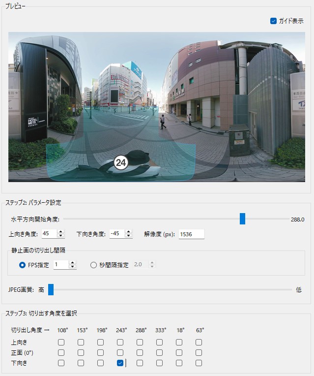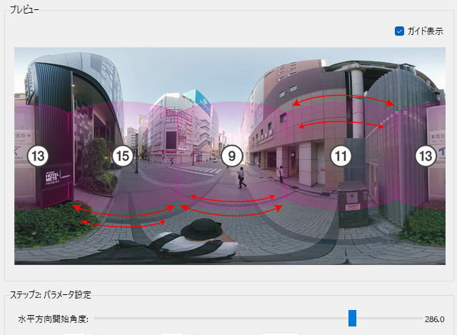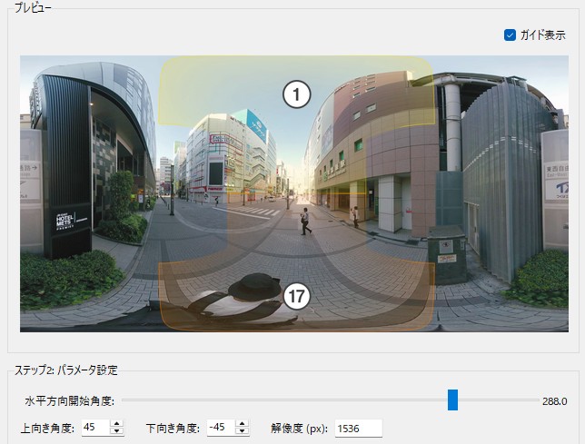 360°動画から画像を切り出したい角度に、その角度の範囲のガイドが表示するようにしました。